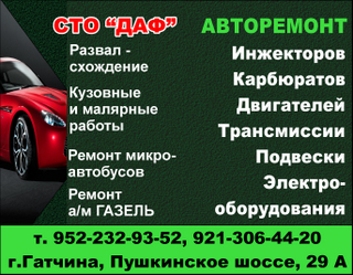 СТО "ДАФ" в Гатчине. Развал-схождение. Кузовные и малярные работы. Авторемонт: инжекторов, карбюраторов, двигателей, трансмиссий, подвески, электро-оборудования. - Развал-схождение - Кузовные и малярные работы - Ремонт микроавтобусов - Ремонт а/м ГАЗЕЛЬ АВТОРЕМОНТ: - Инжекторов - Карбюраторов - Двигателей - Трансмиссий - Подвески - Электро-оборудования Ленинградская область, Гатчинский район, г. Гатчина, Пушкинское шоссе, д. 29-А. Тел.: 8 (952) 232-93-52, 8 (921) 306-44-20. В Интернете (в поисковиках) нас находят, в частности, по таким словам: автосервис Гатчина, автосервис Гатчинский район #автосервис #Гатчина #ГатчинскийРайон