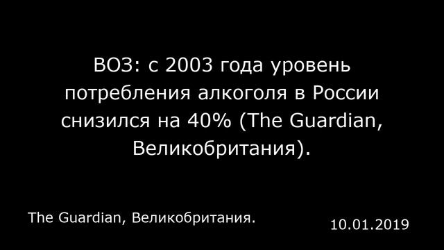 Пресса США https://www.youtube.com/playlist?list=PLK4bbBLT7WW549H298VRDFWCWKk0Ybc4a Пресса Украины https://www.youtube.com/playlist?list=PLK4bbBLT7WW5JspJT2JuBIYm94Es0D3XI Пресса Китая https://www.youtube.com/playlist?list=PLK4bbBLT7WW5zJPrror7LF5S0_E7vEXwx Пресса Германии https://www.youtube.com/playlist?list=PLK4bbBLT7WW6Ylh7J1Gn_zekI-qcLX8Xj Пресса Великобритании https://www.youtube.com/playlist?list=PLK4bbBLT7WW4cnsh4HRNaqCQDSOz-aC8N Пресса Франции Пресса Турции https://www.youtube.com/playlist?list=PLK4bbBLT7WW5qDpUjJuvTt03SLZinlRil А так же пресса: Молдавии, Казахстана, Кубы, КНДР, Палестины, Сингапура, Морокко, Узбекистана, Бельгии, Хорватии, Южной Кореи, Мексики, Судана, Колумбии, Ирака, Канады, ОАЭ, Туниса, Иордании, Грузии, Португалии, Болгарии, Эстонии, Австрии, Словакии, Литвы, Израиля, Сирии, Норвегии, Йемена, Белорусии, Азербайджана, Бахрейна, Катара, Сербии, Аргентины, Швейцарии, Ирана, Бразилии, Дании, Чехии, Польши, Латвии, Испании, Армении, Японии, Ливии, Ливана, Саудовской Аравии, Кувейта, Австралии, Египта, Финляндии, Швеции, Италии и других стран: https://www.youtube.com/view_all_playlists Дорогие слушатели! Подписка на наш канал окажет нам большую поддержку. Благодарим вас за неё! ПОДПИСЫВАЙТЕСЬ НА КАНАЛ: https://www.youtube.com/channel/UCDyxWZW6AabSOwwepI8_bGA?sub_confirmation=1 ВОЗ: с 2003 года уровень потребления алкоголя в России снизился на 40% (The Guardian, Великобритания). The Guardian, Великобритания. 10.01.2019 Возможно, Россия по-прежнему имеет репутацию сильно пьющей нации, однако доклад Всемирной организации здравоохранения показывает, что с 2003 года уровень потребления алкоголя в этой стране снизился на 43%. ВОЗ объясняет такое снижение потребления алкоголя целым рядом мер, принятых под руководством президента Владимира Путина, включая ограничение на продажу алкогольных напитков и продвижение принципов здорового образа жизни. «Российская Федерация долгое время считалась одной из самых пьющих стран в мире», — говорится в докладе ВОЗ, опубликованном во вторник, 1 октября. Там же сказано, что потребление алкоголя было основной причиной резкого роста количества смертей в 1990-х годах. «Однако в последние годы эти тенденции изменились», — отмечается в докладе. Исследование показывает снижение уровня потребления алкоголя на душу населения в России на 43% с 2003 по 2016 год. Одной из причин стало резкое снижение потребления нелегальной алкогольной продукции. При Путине в России был принят целый ряд мер, включая запрет на продажу алкоголя после 11 часов вечера, повышение минимальной розничной цены на спиртные напитки и запрет на рекламу алкоголя. Кроме того, согласно более ранним данным ВОЗ, россияне употребляют меньше алкоголя, чем французы и немцы. В Москве стартовала кампания против курения: на прошлой неделе было объявлено о принятии закона, запрещающего открытый огонь даже на балконах частных квартир. Согласно результатам Глобального опроса взрослого населения о потреблении т... Оригинал публикации: https://www.theguardian.com/world/2019/oct/01/russian-