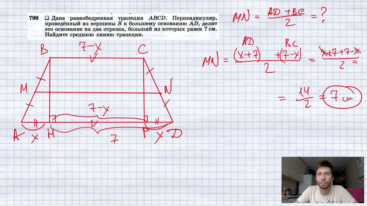 №799. Дана равнобедренная трапеция ABCD. Перпендикуляр, проведенный из вершины В к большему основанию AD, делит это основание на два отрезка, больший из которых равен 7 см. Найдите среднюю линию трапеции. TikTok - https://vm.tiktok.com/WJJwK9 Like - https://likee.com/user/@ge0metriya Мой второй канал для подготовки к ЕГЭ и ОГЭ - https://www.youtube.com/ЕвгенийСумин Инстаграм - https://www.instagram.com/EGE_OGE.math Личный инстаграм - https://www.instagram.com/ee_sumin VK - https://vk.com/evgeniysumin FB - https://www.facebook.com/EvgeniySumin