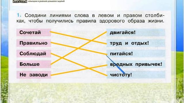 Другие решения смотри тут: https://urokitv.net/21-Reshebnik_GDZ_Okruzhayuschiy_mir_3_klass_Pleshakov_AA_otvety_po_rabochey_tetradi/ Urokitv.net это школьные учебники и решебники с 1-го по 11-й класс школы. Ждем ваших предложений и пожеланий. Если вам нравится, то что мы делаем расскажите про нас своим друзьям и одноклассникам. Чтобы выполнить задание №1 на странице 86, вы должны уметь соединять линиями слова в разных столбиках так, чтобы получались правила здорового образа жизни. Обращайтесь к нашему видео-решению, если хотите выполнить домашнее задание на отлично. Задание 1 Здоровый образ жизни - Окружающий мир 3 класс (Плешаков А.А.) 1 часть