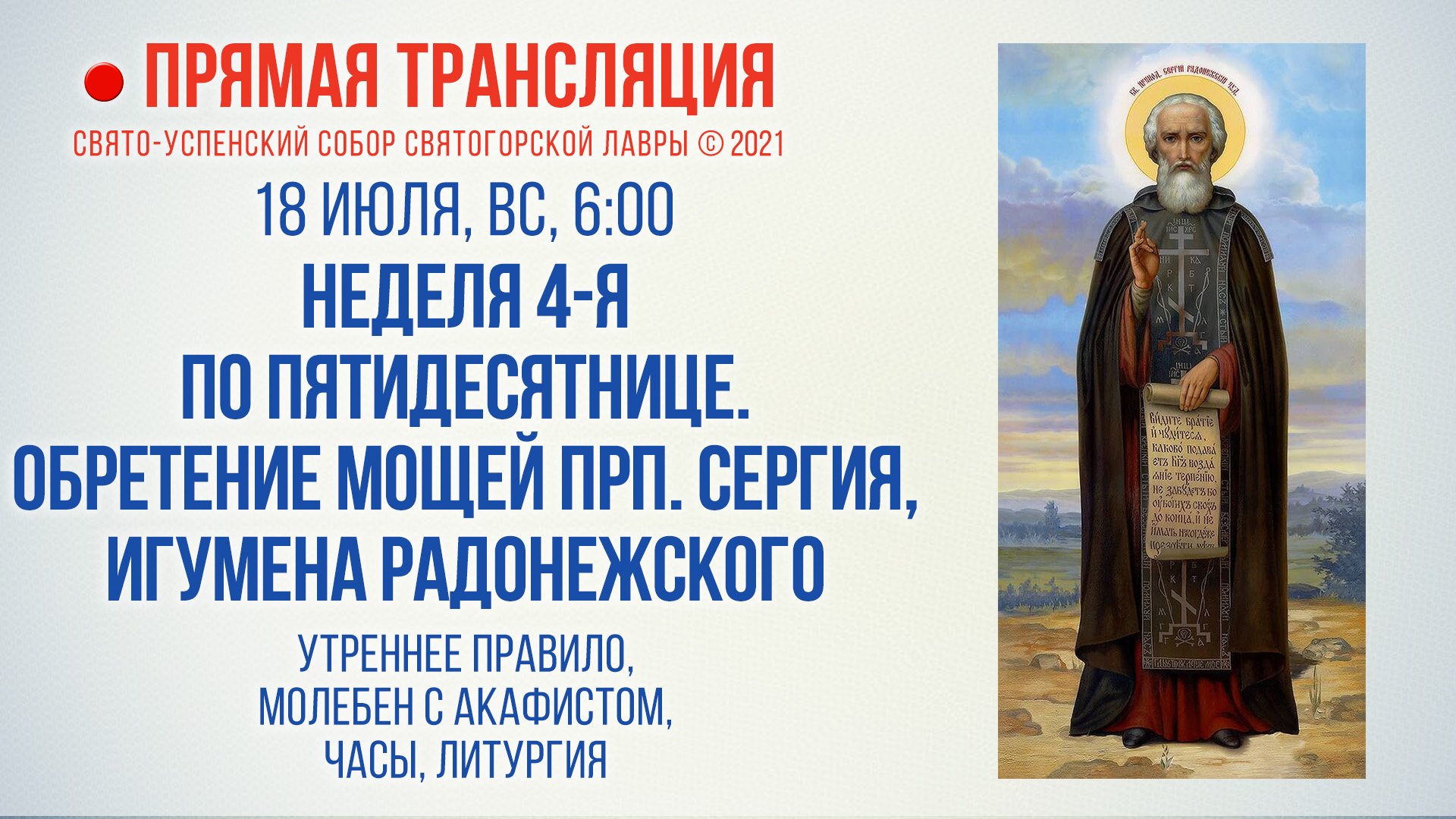 Прямая трансляция. Неделя 4-я по Пятидесятнице. Обретение мощей прп. Сергия, игумена Радонежского