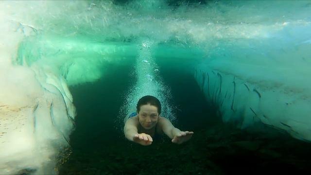 Купальщица ныряет в зимнюю воду.