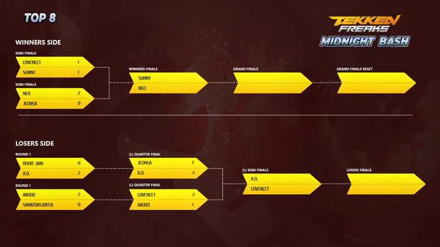 Midnight Bash - Top 8 | hosted by TEKKEN Freaks A discord only tournament where players gather on TEKKEN Freaks Discord server for a showdown. Today a 32 player tournament was held on Discord out of which only 8 survived so far, only their iron will may decide the winner. Feel free to join the server to not only participate in future tournaments but also to learn and share your experiences of Tekken. Bracket Link: https://challonge.com/2eef4604e6754308b03d7c276a5cf800 Join our discord for more action: https://discord.io/tekkenfreaks Commentator: Hans, Inferno Sparda & Jeonsa Organizer: Raging Mode & SS Hunt Also follow us on: Twitter: https://twitter.com/tekkenfreaks Twitch: https://www.twitch.tv/tekkenfreaks Instagram: https://www.twitch.tv/tekkenfreaks Youtube: https://www.youtube.com/tekkenfreaks Facebook: https://www.facebook.com/TEKKENFreaks/ Website: https://tekkenindia.in/ Participants: RTG Sunny Loveneet Neo Jeonsa AD Knightwing Sanatdas Rohit Jain 00:00:00 - Intro 00:06:55 - Neo Vs. Jeonsa 00:17:33 - Sunny Vs. Loveneet 00:36:22 - Sanatdas30feb Vs. AIKIDO 00:45:00 - A.D. Vs. Rohit Jain 00:55:57 - Loveneet Vs. AIKIDO 01:08:40 - Jeonsa Vs. A.D. 01:25:00 - A.D. Vs. Loveneet 01:35:04 - Sunny Vs. Neo (Winners Final) 01:56:28 - Neo Vs. Loveneet (Losers Final) 02:10:08 - Phonebond Promo 02:15:03 - Sunny Vs. Loveneet (Grand Finals)