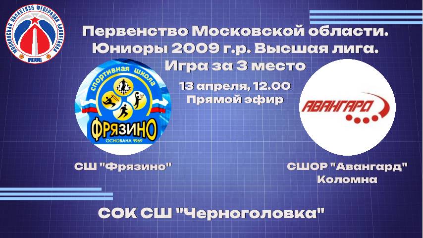 Матч за третье место ! Фрязино и Коломна сойдутся в битве за бронзу! 13 апреля, 12:00, Спорткомплекс наукограда превратится в эпицентр баскетбольного противостояния! Здесь, на паркете, разыграется Финал 4-х Высшей лиги Первенства Московской области по баскетболу среди юниоров 2009 года рождения! После напряжённых месяцев борьбы, четыре лучшие команды региона сойдутся в ожесточённой борьбе за звание чемпиона! Они продемонстрировали исключительный талант, упорство и командный дух на протяжении всего сезона, и теперь готовы отдать все силы ради победы!