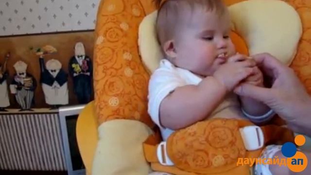Малышка на видео впервые пробует твердое печенье. Девочке семь месяцев, она уже умеет есть кусочки хлеба, а сейчас ей впервые дали печенье. Обратите внимание на голос мамы за кадром: она очень спокойна, поэтому и девочка не боится новой пищи. Малыши часто выталкивают твердые кусочки изо рта движением языка вперед. Это совсем не значит, что ребенок не хочет съесть предложенную пищу. Такое движение языком он привык совершать при сосании. Теперь, когда в рот попала твердая пища, рефлекторно начинает делать то же самое, что и раньше. Для пережевывания твердой пищи нужны другие движения языка - не вперед, а из стороны в сторону. Кстати, они нужны и для того, чтобы говорить. Мы можем помочь малышу научиться жевать. Поместите кусочек печенья между щекой и верхней челюстью в районе жевательных зубов. Стараясь передвинуть еду в привычное место в центре языка, малыш просто вынужден будет начать двигать языком из стороны в сторону. Не забывайте класть кусочки еды то слева, то справа. Повторяйте обучение регулярно во время еды, по три-четыре кусочка с каждой стороны, и скоро вы заметите, что у ребенка появился навык правильного жевания. Не жалейте времени на обучение малыша. Жевательные движения - прообраз произнесения слога: рот открыт – произносится гласный звук, рот закрывается – согласный. Вот так, жуя печенье, ребенок готовится заговорить! #раннее_развитие #кормление #Даунсайдап #синдромдауна Благотворительный фонд «Даунсайд Ап» оказывает бесплатную психолого-педагогическую помощь семьям с детьми с синдромом Дауна. Больше информации — на сайте https://downsideup.org