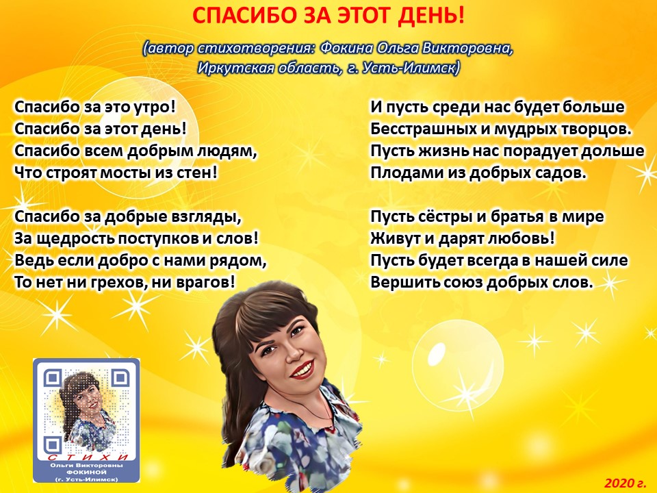 Читает автор стихотворения: ФОКИНА ОЛЬГА ВИКТОРОВНА (Иркутская область, город Усть-Илимск) СТИХИ: https://stihi.ru/2018/07/08/3790 БИОГРАФИЯ: http://www.proza.ru/2019/10/08/1473 ВЫИГРЫВАЙТЕ КНИГИ БЕСПЛАТНО: https://proza.ru/2017/09/17/447 ОТЗЫВЫ ЧИТАТЕЛЕЙ: http://www.proza.ru/2019/11/29/611 Из книги Фокиной Ольги Викторовны (Усть-Илимск) «Несу добро в ладошках!»: [все стихотворения с 2005 по октябрь 2020 гг., проза, авторские песни, интервью]. – Москва: МГО Союза писателей России, 2020 г. – 886 стр., ил. ISBN 978-5-7949-0826-8 СПАСИБО ЗА ЭТОТ ДЕНЬ! (автор стихотворения: Фокина Ольга Викторовна, Иркутская область, г. Усть-Илимск) Спасибо за это утро! Спасибо за этот день! Спасибо всем добрым людям, Что строят мосты из стен! Спасибо за добрые взгляды, За щедрость поступков и слов! Ведь если добро с нами рядом, То нет ни грехов, ни врагов! И пусть среди нас будет больше Бесстрашных и мудрых творцов. Пусть жизнь нас порадует дольше Плодами из добрых садов. Пусть сёстры и братья в мире Живут и дарят любовь! Пусть будет всегда в нашей силе Вершить союз добрых слов. 12 августа 2020 г.