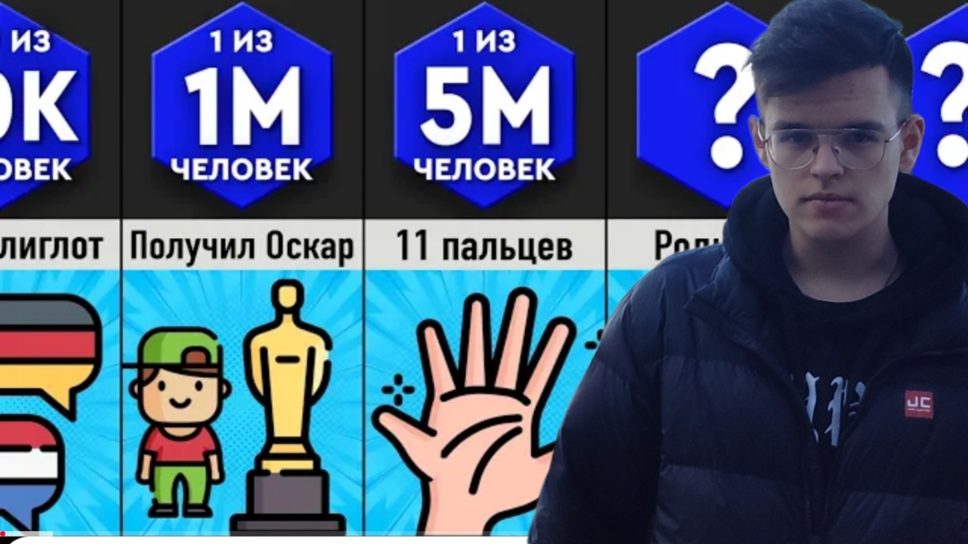 1. Вероятность родиться Проблема оценки: Сложность заключается в том, что мы не можем точно знать, сколько потенциальных беременностей не случается (например, из-за ранних выкидышей или отсутствия зачатия). Ориентировочная оценка: Некоторые эксперты считают, что шансы на то, что конкретный ребенок родится у конкретных родителей, могут быть очень низкими – порядка 1 к нескольким миллионам или даже миллиардам. Эта оценка учитывает множество факторов: Необходимость встречи конкретной яйцеклетки и сперматозоида. Успешное оплодотворение. Успешная имплантация в матке. Успешное вынашивание беременности до родов. 2. Полидактилия (шесть пальцев) Вероятность: Полидактилия, наличие большего количества пальцев на руках или ногах, не такое уж и редкое явление по сравнению с другими генетическими аномалиями. Встречается примерно 1 на 500 - 1000 рождений. Причины: Может быть вызвана генетическими мутациями или факторами окружающей среды во время беременности. Часто передается по наследству. Разновидности: Полидактилия может проявляться по-разному – от небольшого кожного выроста до полноценного функционирующего пальца. 3. Генетические заболевания (редкие формы) Проблема оценки: Существуют тысячи редких генетических заболеваний, и вероятность каждого из них крайне мала. Пример: Допустим, конкретное редкое генетическое заболевание встречается у 1 на миллион человек. Это означает, что вероятность родиться с этим заболеванием составляет 1 к 1 000 000. Важно: Вероятность повышается, если в семье уже были случаи этого заболевания или если родители являются носителями мутации, вызывающей заболевание. 4. Стать жертвой удара молнии Вероятность: В течение жизни вероятность быть пораженным молнией составляет примерно 1 к 15 000. Вероятность погибнуть от удара молнии гораздо ниже – примерно 1 к 165 000. Факторы риска: Пребывание на открытом пространстве во время грозы, занятия спортом на открытом воздухе, работа на улице. 5. Родиться с синдромом русалки (сиреномелия) Вероятность: Крайне редкое заболевание, при котором ноги срастаются вместе, напоминая хвост русалки. Встречается примерно 1 на 100 000 рождений. Выживаемость: Большинство детей с сиреномелией умирают вскоре после рождения из-за серьезных проблем с внутренними органами. 6. Быть убитым метеоритом Вероятность: Очень сложно оценить, но считается крайне низкой. Вероятность погибнуть от падения метеорита оценивается примерно в 1 к нескольким триллионам. До сих пор нет подтвержденных случаев гибели людей от падения метеоритов. 7. Выиграть в лотерею (крупный джекпот) Вероятность: Зависит от конкретной лотереи, но обычно очень низкая. Например, вероятность выиграть в Powerball (США) составляет примерно 1 к 292 миллионам. Важные моменты: Вероятность – это не гарантия: Даже если вероятность события очень мала, это не значит, что оно не может произойти. Независимые события: Вероятность одного события не влияет на вероятность другого, если они не связаны между собой. Риск и восприятие: Люди часто переоценивают вероятность редких, но драматичных событий (например, нападение акулы) и недооценивают вероятность более распространенных, но менее заметных рисков (например, автомобильная авария). 🗣️Телеграмм - https://t.me/piterband 😁 Спасибо за просмотр 😁 💯Ставь лайк и подписывайся💯 📸Социальные сети : ▪️Rutube - https://rutube.ru/channel/24021989 