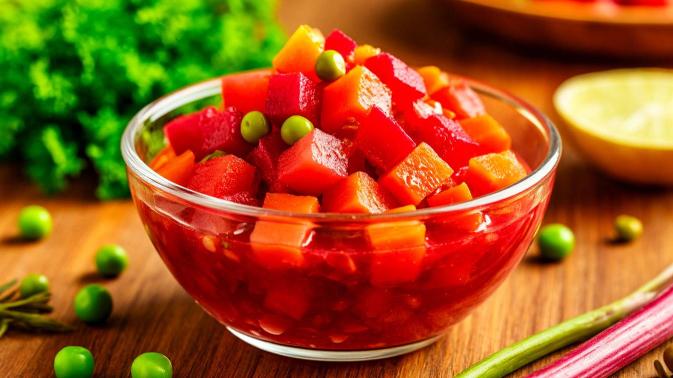 Винегрет – всеми известный и всеми любимый салат! Но сегодня будем готовить праздничный винегрет, который действительно станет украшением вашего стола. Благодарю подаче – в салатном кольце, использованию картофеля в виде чипсов, а не в мундире. Особую пикантность винегрету придаст горчично-лимонная заправка. Винегрет – очень полезное блюдо, настоящая зимняя кладовая витаминов и полезных веществ. Смотрите видео и готовьте вместе со мной этот замечательный салат! Ингредиенты: 1.Консервированная фасоль – 400 г. 2.Свекла – 300 г. 3.Морковь – 200 г. 4.Соленые огурцы – 250 г. 5.Картофель – 200 г. 6.Зеленый лук – 50 г. 7.Растительное масло – 100 мл. 8.Горчица – 1 ч.л. 9.Лимонный сок – 1 ч.л. Дорогие друзья! Если вам понравился наш контент и вы хотите видеть больше интересных материалов, не забудьте подписаться на наш канал в телеграмме https://vk.cc/cC6iZj ! Ваши лайки и комментарии вдохновляют нас создавать ещё больше качественного контента.