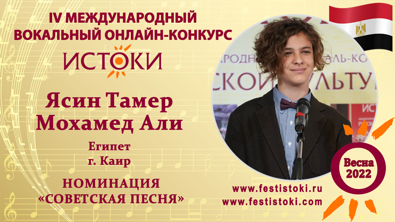 Лауреат III степени IV Международного вокального онлайн-конкурса «Истоки».Весна-2022. Номинация "Советская песня". Песня "Полет на дельтаплане" Композитор Эдуард Артемьев, Поэт Николай Зиновьев. Сайт: www.festistoki.ru / www.festistoki.com E-mail: festistoki@mail.ru