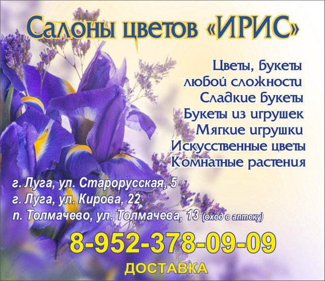 Салон цветов "Ирис" в Луге: цветы, букеты, мягкие игрушки, бесплатная доставка Приглашаем посетить наши уютные салоны цветов! В салонах "Ирис" для вас: - Авторские работы из живых и искусственных цветов - Оформление свадебных букетов и юбилейных корзин - Оригинальное оформление подарков - Композиции и просто цветы - Сладкие букеты - Букеты из игрушек - Мягкие игрушки - Искусственные цветы - Комнатные растения А также осуществляем доставку по городу (от 1500 руб. - бесплатно) Один букет каждое воскресенье - со скидкой. Пенсионерам предоставляются скидки. Ленинградская область, г. Луга, ул. Старорусская, д. 5 (здание "Магнит Косметик") Ленинградская область, г. Луга, ул. Кирова, д. 22 Лужский район, п. Толмачево, ул. Толмачева, д. 13 (вход в аптеку) Телефон для заказов: 8 (952) 378-09-09 Группа ВК: vk.com/public177603096 m.vk.com/club177603096 В Интернете (в поисковиках) нас находят, в частности, по таким словам: цветы Луга, букеты Луга, доставка цветов Луга, свадебные букеты Луга, салон цветов Луга. #цветыЛуга #букетыЛуга #доставкацветовЛуга #свадебныебукетыЛуга #салонцветовЛуга #Луга #Лужскийрайон