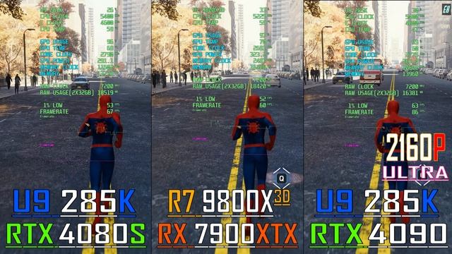 RTX 4080 SUPER + CORE U9 285K vs RX 7900XTX + RYZEN 7 9800X3D vs RTX 4090 + CORE U9 285K ||| PC GAMES BENCHMARK TEST || 2160P || #u9285k #ryzen79800x3d #rx7900xtx #rtx4090 #rtx4080super #exploringbenchmark SYSTEM :- OS Windows 11 CPU CORE ULTRA 9 285K MOBO Asus ROG Strix Z890-E Gaming CPU RYZEN 7 9800X3D MOBO Asus ROG Strix X870E-E Gaming COOLER CORSAIR ICUE H150I ELITE GPU Asus TUF Gaming RTX 4080 SUPER 16GB GPU Sapphire Nitro+ AMD Radeon RX 7900XTX 24GB GPU Asus TUF Gaming RTX 4090 24GB RAM Corsair Dominator 64GB DDR5 7200MHz SSD Samsung 980 PRO 2TB PCIe 4.0 NVMe M.2 HDD WD Blue 4TB Desktop Hard Disk Drive PSU CORSAIR RMX SERIES RM1000X 1000 WATT THANK YOU FOR WATCHING-- Your support is very important, please like and subscribe to the channel. Теги: intel vs amd,amd vs nvidia,radeon vs geforce,4k gameplay,4k benchmark,4k gaming,exploring benchmark,explore benchmark,rtx 4090,4090,rx 7900xtx,7900xtx,4090 vs 7900xtx,7900xtx vs 4090,rtx 4080s,566.36,24.12.1,ultra 9 285k,u9 285k,285k,ryzen 7 9800x3d,r7 9800x3d,9800x3d,285k vs 9800x3d,9800x3d vs 285k,285k + 4090,4090 + 285k,9800x3d + 7900xtx,7900xtx + 9800x3d,rtx 4080 super,4080 super,4080s vs 4090,4090 vs 4080s,285k + 4080s,4080s + 285k