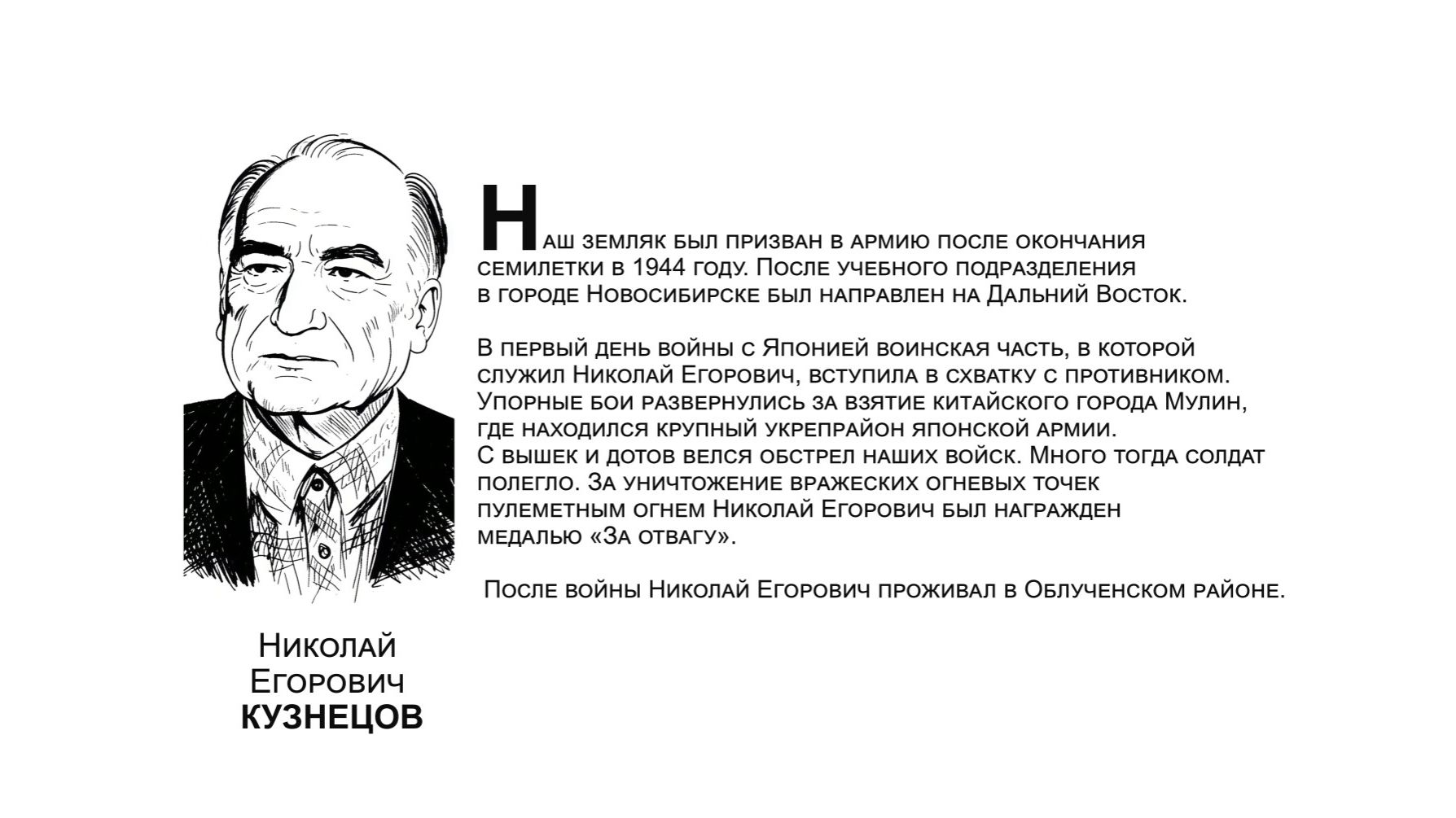 В годы Великой Отечественной войны на фронт ушли более 11 тысяч жителей ЕАО, семь тысяч наших земляков погибли или пропали без вести. Те, кто вернулись, прожили достойную жизнь. Они строили дома, выращивали хлеб, учили детей, стояли на охране правопорядка. Этим людям мы посвящаем нашу галерею "Бессмертный взвод". Среди героев - Николай Егорович КУЗНЕЦОВ.