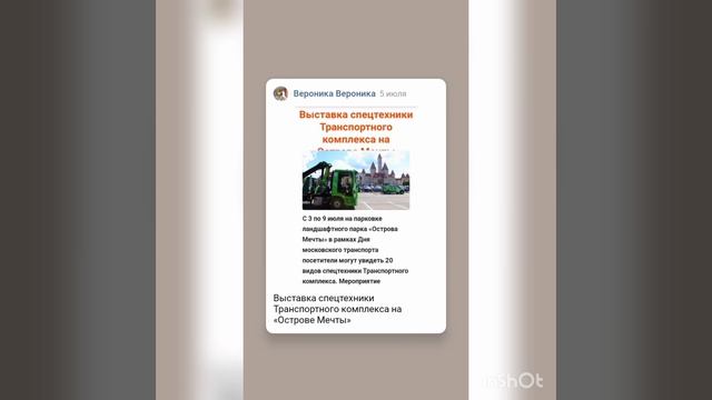 Выставка спецтехники Транспортного комплекса на «Острове Мечты» С 3 по 9 июля на парковке ландшафтного парка «Острова Мечты» в рамках Дня московского транспорта посетители могут увидеть 20 видов спецтехники Транспортного комплекса. Мероприятие бесплатное. Одним из главных экспонатов является головной вагон поезда «Москва-2020», где можно осмотреть не только салон, но и кабину машиниста. Также на выставке представлены: вагон трамвая «Львенок-Москва», оборудованный местами для колясок и креплениями для велосипедов; электробус КАМАЗ 2023 года выпуска; автобус - «гармошка» ЛиАЗ; эвакуаторы «Московского паркинга»; автомобиль службы дорожного патруля ЦОДД и другие виды спецтехники Транспортного комплекса. ВРЕМЯ: С 3 по 9 июля, с 9:00 до 21:00; МЕСТО: наземная парковка «Острова Мечты»; СТОИМОСТЬ: бесплатно. #2023 #москва #выставка #бесплатно