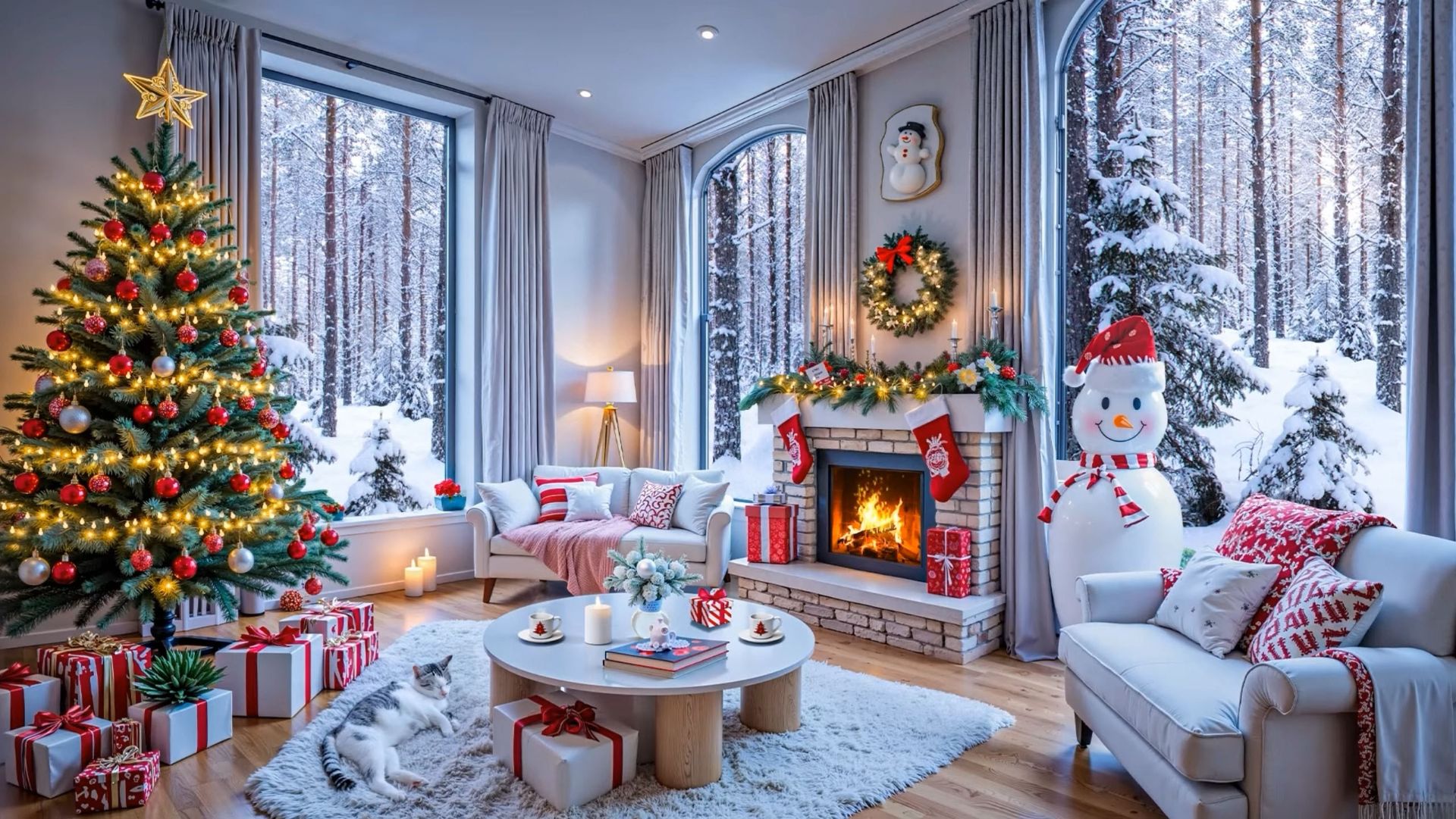 Светлая новогодняя гостиная с украшенной ёлкой, горящим камином и подарками создаёт атмосферу спокойствия и уюта. За большими окнами — заснеженный лес, внутри — мягкий тёплый свет, свечи и праздничный декор. Это видео идеально подойдёт для расслабления, отдыха, сна, чтения или как уютный фон в зимний вечер ❄️🔥 Хештеги (в описание): #новогоднийуют #камин #новыйгод #елка #зимнийвечер #уютныйдом #рождество #релакс новогодний камин, новогодний уют, елка и камин, зимний вечер дома, уютный дом зима, камин с огнем, новогодняя гостиная, рождественская атмосфера, камин для отдыха, камин для сна, уютное видео, праздничный интерьер, зимний лес за окном