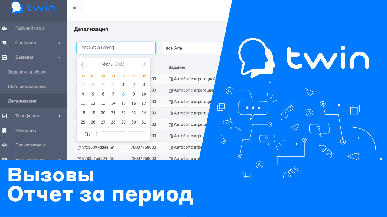 Twin. Отчет по звонкам за период времени или дат