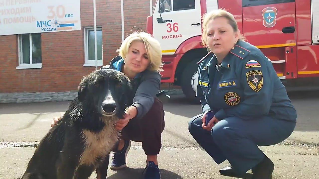 Волонтеры приюта Щербинка в Пожарной части №36 г.Щербинка: питомцы МУХА и ТЁТКА и сотрудники ПСЧ