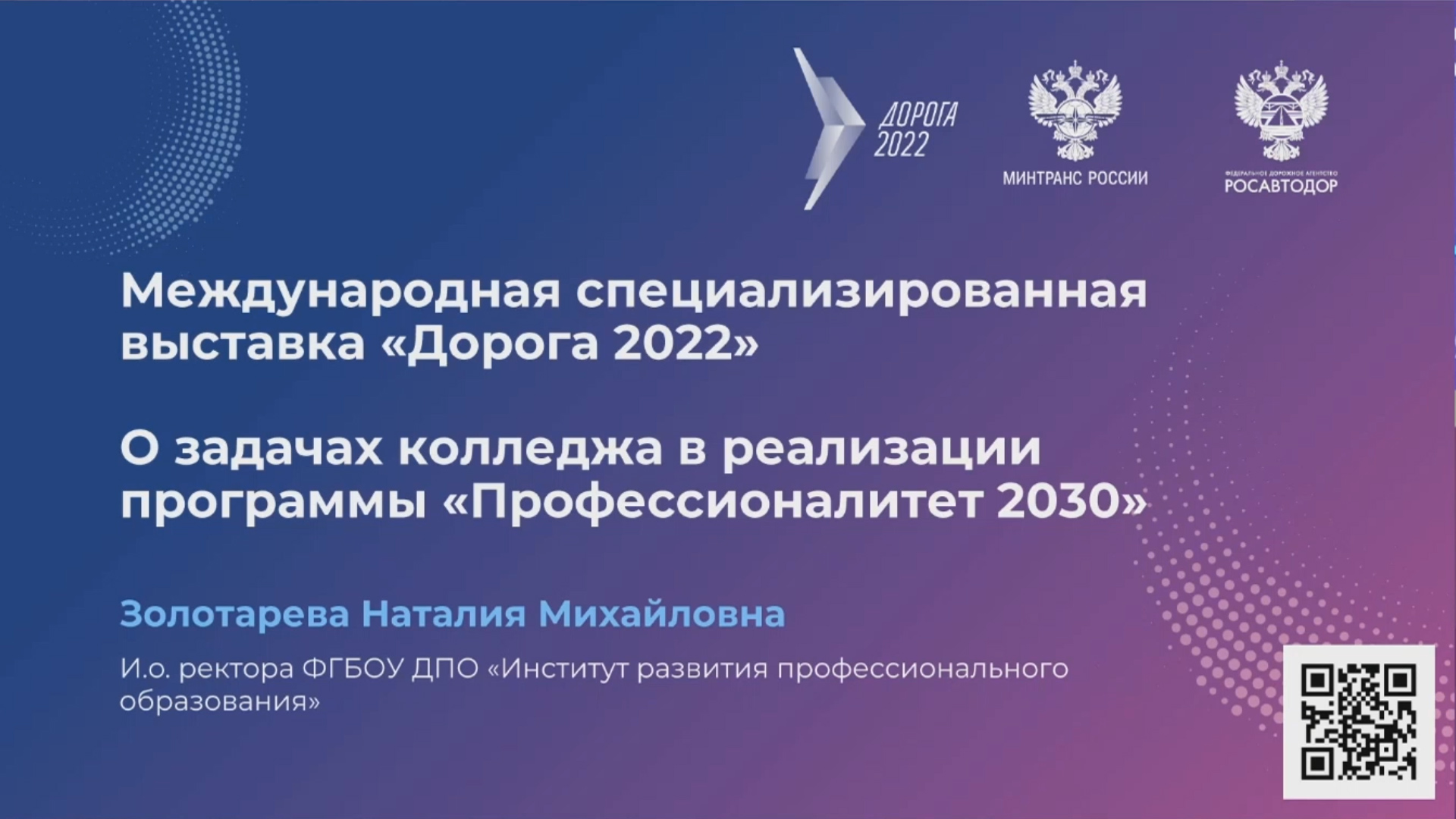 Наталья Золотарева "О задачах колледжа в реализации программы "Профессионалитет". Международная специализированная выставка "Дорога 2022", Казань