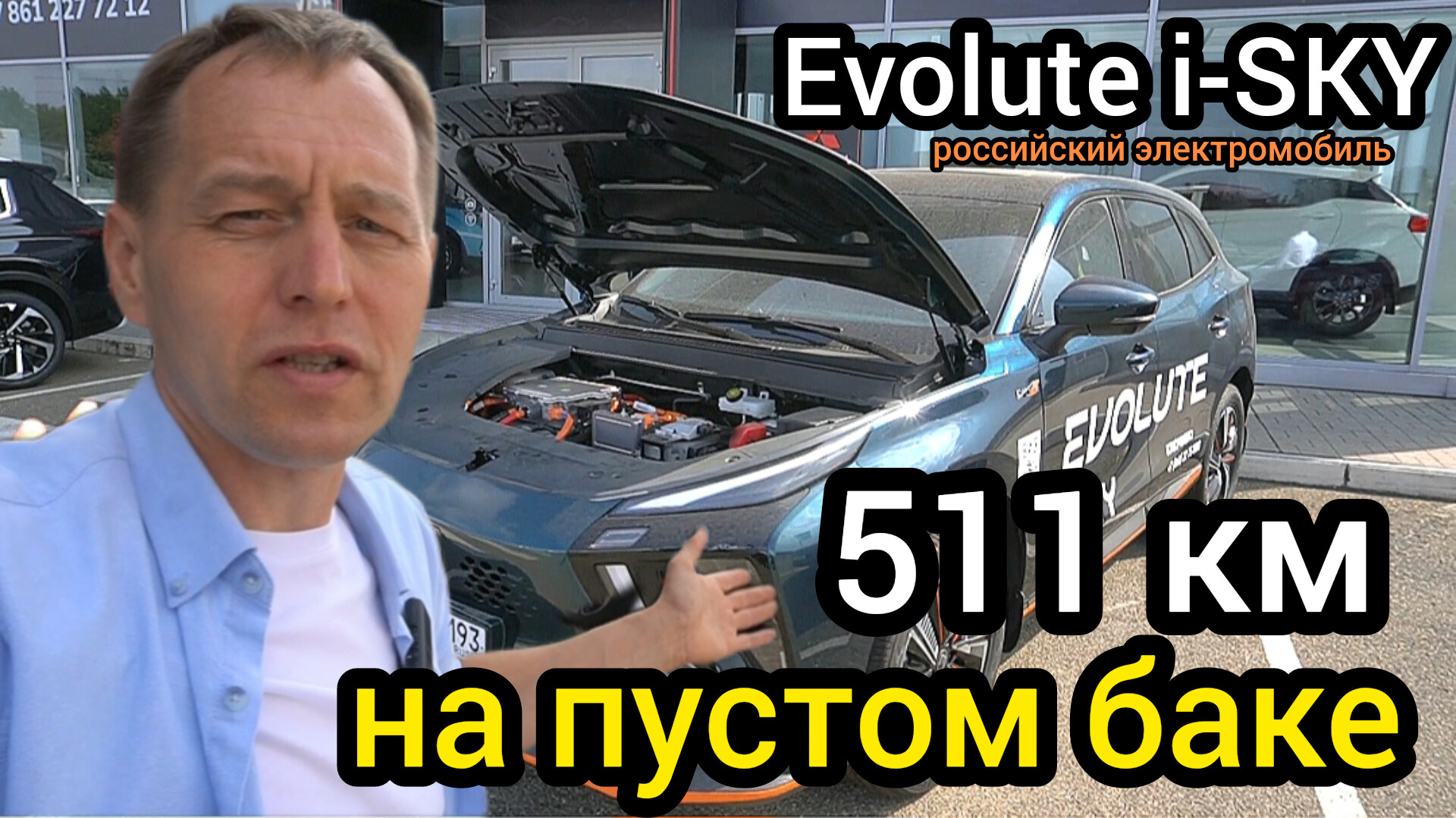 Обзор EVOLUTE i-SKY (2023 г.в.) - российский, пятидверный, пятиместный электромобиль класса - C. Производство, а точнее локализация электроавтомобилей налажена на автозаводе "Моторинвест" в Липецкой области. Простыми словами EVOLUTE i-SKY это переименованный Dongfeng Thunder SX5GEV, продающийся на российском рынке под брендом EVOLUTE. Габариты кузова: длина: 4565 мм, ширина: 1860 мм, высота: 1680 мм, колёсная база: 2715 мм. Дорожный просвет 175 мм. Размер колёс 235/55/R19. Объем багажного отделения 480 л. Снаряжённая масса 2025 кг, полная - 2345 кг. На передней оси подвеска независимая, пружинная (типа Макферсон). На задней оси подвеска независимая, пружинная (Многорычажка). Тормоза дисковые. Мощность электромотора 204 л.с. Привод передний. Разгон до 100 км/ч 8,6 с. Максимальная скорость 180 км/ч. Запас хода 511 км. Три режима езды: ECO/Comfort/Sport. Емкость батареи 85,9 кВ.ч Система охлаждения батареи жидкостная. Время медленной зарядки от розетки 220 В - 15 ч. Время быстрой зарядки 45 мин.