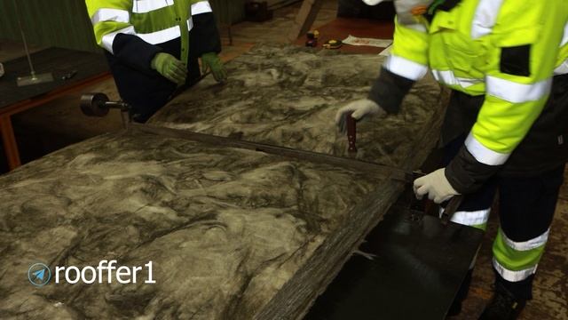 Как проверяют минеральную вату на заводе? На примере рулонного материала, для скатных частей. Берется выборочно рулон материала, укладывается на стол и разрывается упаковка. Дальше снимают размеры по длине, ширине и толщине. Затем отрезают от рулона кусок - длинной 1 м.п., и вставляют его в специальный стенд, затем этот кусок нагружают весом и смотрят будет прогибаться или нет. По нормативам нагрузку плита в стенде должна выдерживать 2,5 кг. Но на стенде мы видим, что реальную нагрузку выдерживает и больше - 5,5 кг. Этот опыт показывает то, что даже при такой большой ширине - 1 м.п., плита толщиной 15 см., отлично будет стоять в каркасе.