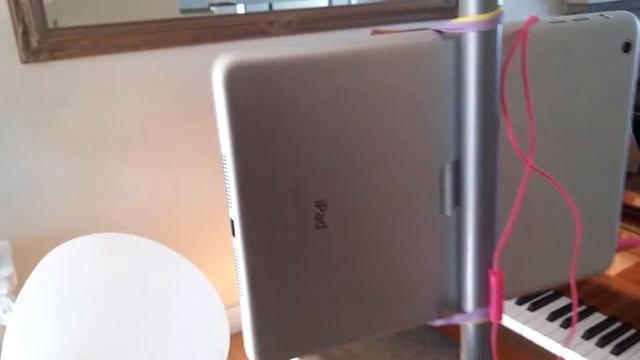 Don't have a tripod, no problem! Use some strong elastic bands and a floor lamp to set up your device for a Skype/Facetime conference or piano lesson. In this short video I'll show you how to set up your ipad, iphone, ipod, android phone or small tablet for a video conference or skype lesson with no complicated equipment. All you need is a floor lamp, or other post and some elastic bands! Make your own tripod! It's this easy.
