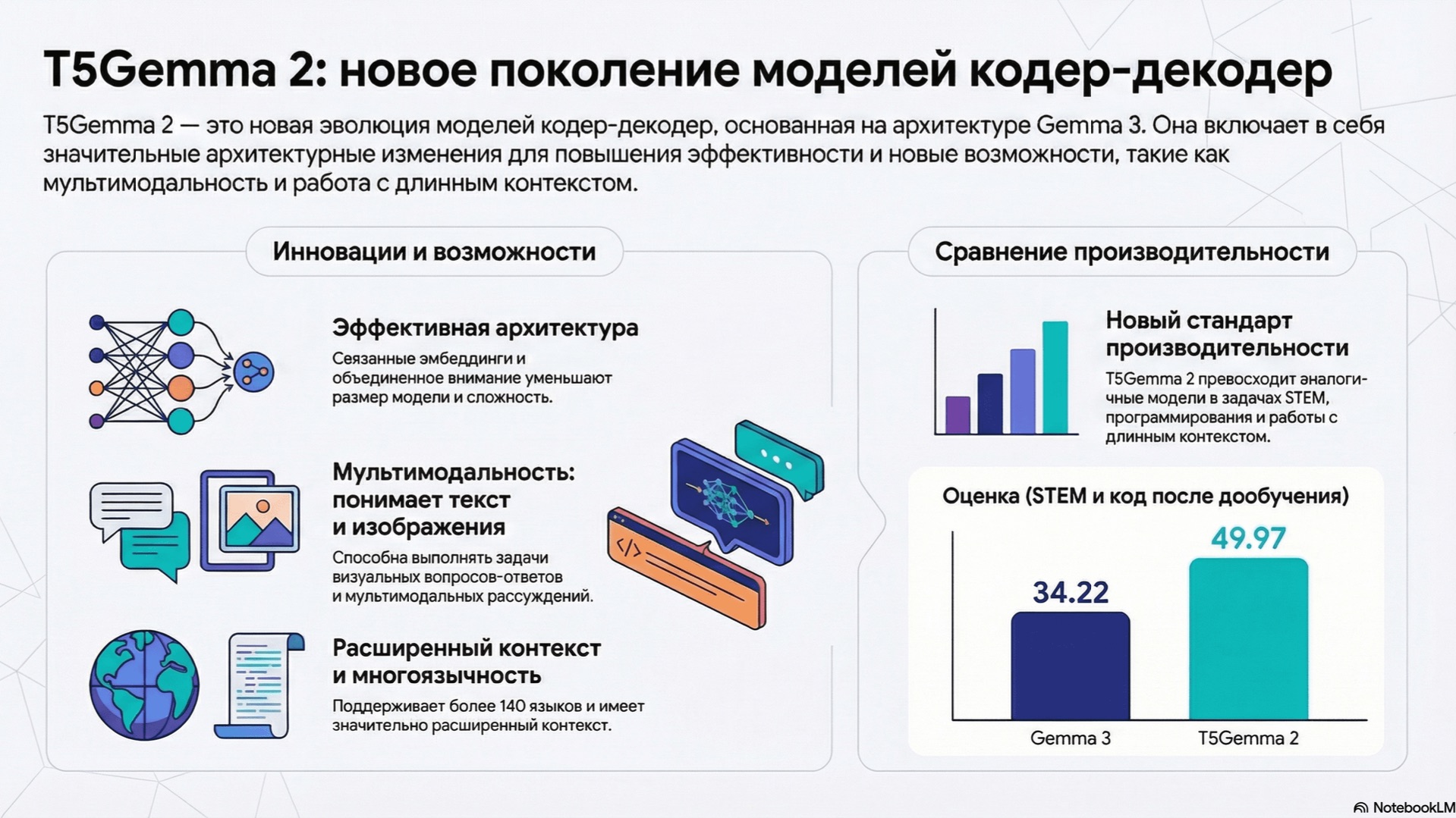 T5Gemma 2: Следующее поколение моделей кодировщик-декодировщик T5Gemma 2 представляет собой следующую ступень развития моделей кодировщик-декодировщик, основанную на семействе Gemma 3 и включающую значительные архитектурные изменения, а не просто переобучение. Модель предлагает компактные предобученные версии размером от 270M до 4B параметров, что делает их идеальными для быстрого экспериментирования и развертывания на устройствах. Ключевые архитектурные инновации включают связанные встраивания слов между кодировщиком и декодировщиком, а также объединенный механизм внимания в декодировщике, направленные на уменьшение числа параметров и повышение эффективности. Новая модель также обладает возможностями следующего поколения, унаследованными от Gemma 3, такими как мультимодальность, позволяющая ей обрабатывать изображения наряду с текстом для ответов на визуальные вопросы. Кроме того, T5Gemma 2 значительно расширяет окно контекста до 128 тысяч токенов и поддерживает более 140 языков. Тесты производительности показывают, что T5Gemma 2 устанавливает новые стандарты для компактных моделей кодировщик-декодировщик, превосходя Gemma 3 в мультимодальных, длинноконтекстных и общих возможностях. Эти предобученные контрольные точки теперь широко доступны на таких платформах, как Kaggle, Hugging Face и Vertex AI, для разработчиков, желающих дообучить их для конкретных задач. #T5Gemma2 #КодировщикДекодировщик #МоделиИИ #МультимодальныйИИ #ДлинныйКонтекст #НЛП #КомпьютерноеЗрение #МашинноеОбучение #Gemma3 #GoogleAI документ - https://blog.google/technology/developers/t5gemma-2/ подписаться - https://t.me/arxivpaperu отправить донаты: USDT: 0xAA7B976c6A9A7ccC97A3B55B7fb353b6Cc8D1ef7 BTC: bc1q8972egrt38f5ye5klv3yye0996k2jjsz2zthpr ETH: 0xAA7B976c6A9A7ccC97A3B55B7fb353b6Cc8D1ef7 SOL: DXnz1nd6oVm7evDJk25Z2wFSstEH8mcA1dzWDCVjUj9e создано с помощью NotebookLM