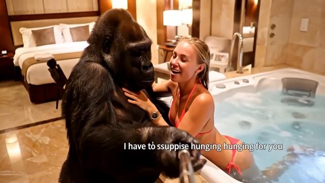 Обезьяна и красивая девушка в ванне с горячей водой.