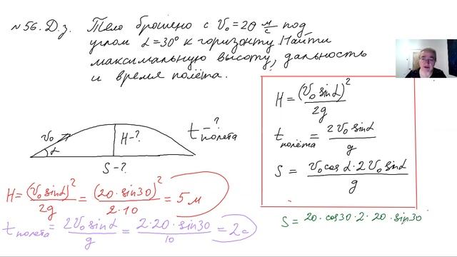 тема ДВИЖЕНИЕ ТЕЛА, БРОШЕННОГО ПОД УГЛОМ К ГОРИЗОНТУ 0.00 разбор домашнего задания задача 56 6.10 задача 57 9.50 домашнее задание задача 58