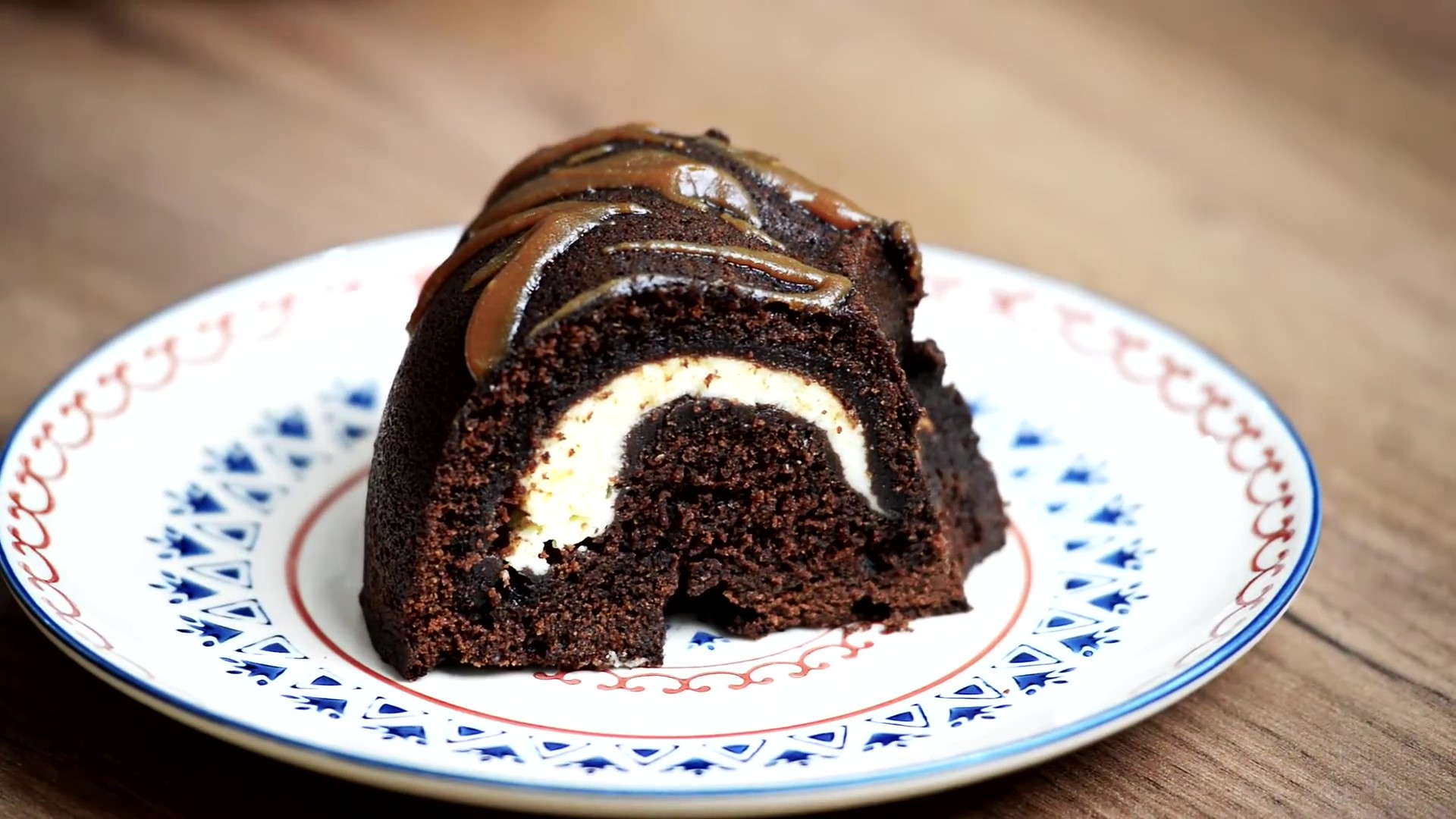 Ингредиенты: Для теста: Мука — 220 г. Какао-порошок — 65 г. Сахар — 350 г. Разрыхлитель — 5 г. Сада — 4 г. Соль — 2 г. Растительное масло — 120 мл. Яйца — 2 шт. Сметана — 180 г. Кефир — 120 мл. Ванильный экстракт — 1 ч.л. Горячая вода — 120 мл. Для сырной начинки: Сливочный сыр — 340 г. Яйцо — 1 шт. Сахар — 50 г. Ванильный экстракт — 1 ч.л. 1. Разогреть духовку до 180 °С. 2. В большой миске смешать муку, какао-порошок, разрыхлитель, соду и соль. Отложить в сторону. 3. В другой миске взбить миксером яйца с сахаром до белой пены. Продолжая взбивать добавить сметану «комнатной температуры», растительное масло и кефир. Затем постепенно добавить сухие ингредиенты и горячею воду. Взбить до однородной массы. 4. Приготовить сырную начинку. Сливочный сыр «комнатной температуры» взбить миксером до однородной массы без комков, затем добавить сахар, яйцо и ванильный экстракт. Хорошо всё взбить до однородности. 5. Половину шоколадного теста вылить в форму смазанную маслом. Затем сверху равномерно распределить сырную массу, не касаясь краёв формы. Залить оставшимся тестом. 6. Выпекать 55-65 минут. Готовность проверить деревянной шпажкой. 7. Вынуть из духовки. Оставить на 15 минут, затем извлечь из формы и дать полностью остыть при комнатной температуре. По желанию сверху полить карамельным соусом. 8. Хранить в холодильнике.