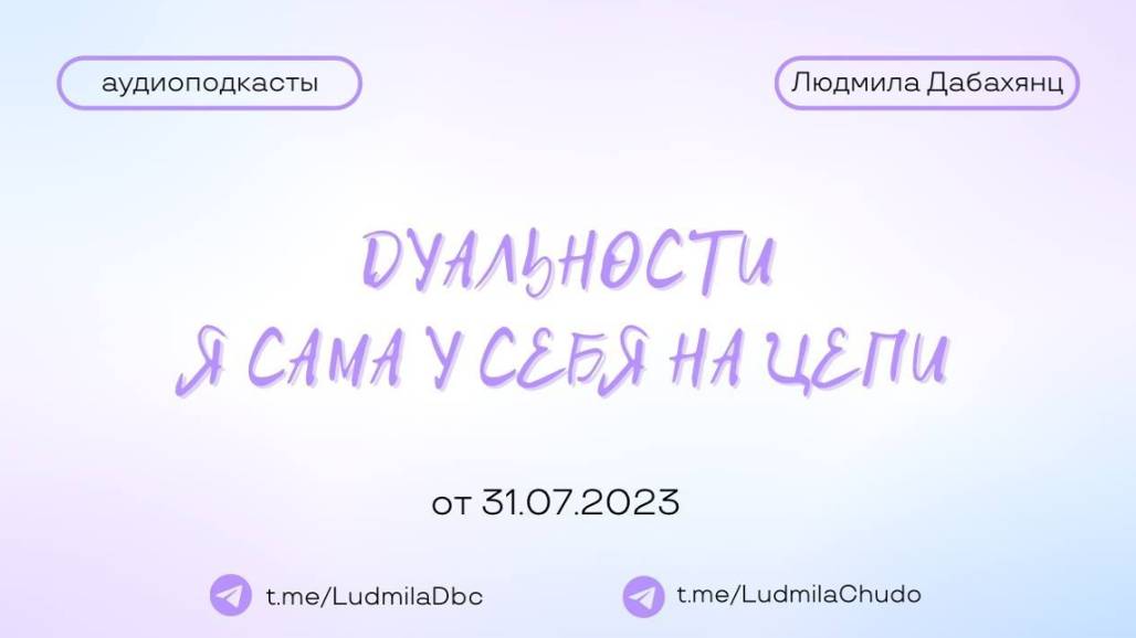 Аудиоподкаст от 31.07.23 На тему «Дуальности. Я сама у себя на цепи» ТЫ МОЖЕШЬ ПРИЙТИ СО СВОИМ ЗАПРОСОМ! ✓ Обязательно поставь лайк ✓ Подпишись на канал ✓ И поделись с близкими Это будет вашим балансом за движение и получение энергии. Если есть желание создать баланс брать-давать... приму от всего сердца с благословением (донейшн). С Огромной Любовью, Дабахянц Людмила ✨ Telegram: https://t.me/ludmiladbc ✨ Канал в telegram “Я ЕСТЬ ТО, ЧТО Я ЕСТЬ”: https://t.me/LudmilaChudo ✨Онлайн-школа: https://ludmilachudo.skillspace.ru/school