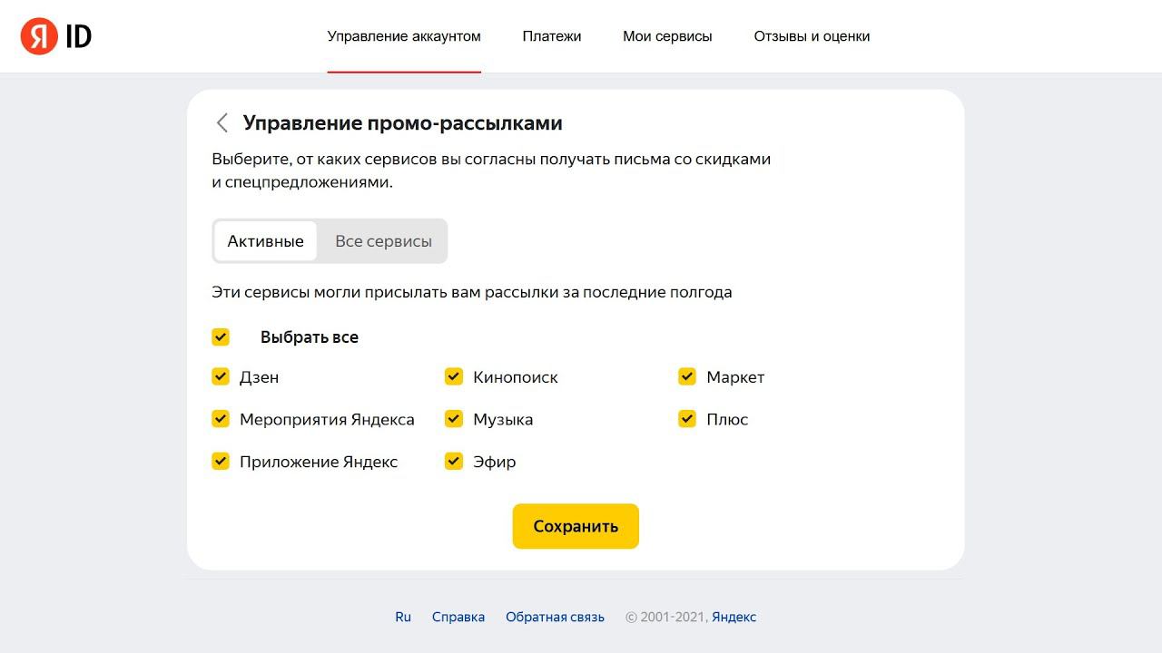 Управление промо-рассылками в ваш Яндекс ID