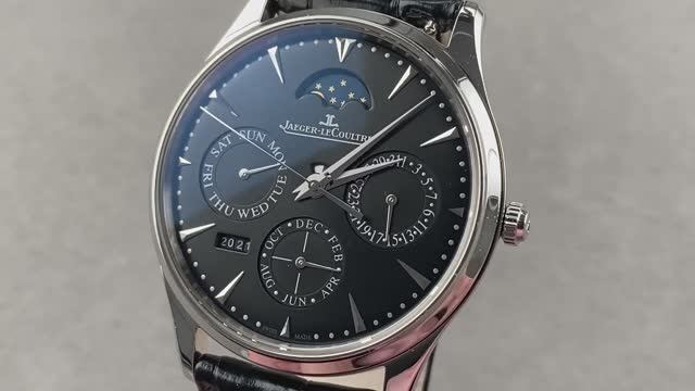 *перевести видео можно в Яндекс браузере Ультратонкие часы Jaeger-LeCoultre Master Perpetual Q1308470 выполнены из нержавеющей стали толщиной 39 мм и окружены черным циферблатом на черном ремешке из кожи аллигатора. Часы Jaeger-LeCoultre Master Ultra Thin Perpetual оснащены функциями часов, минут, секунд, дня недели, даты, месяца, года, вечного календаря, индикатора утра/вечера и фазы Луны. Толщина этих часов Jaeger-LeCoultre также составляет 9,4 мм, а расстояние от выступа до выступа составляет 45,7 мм.