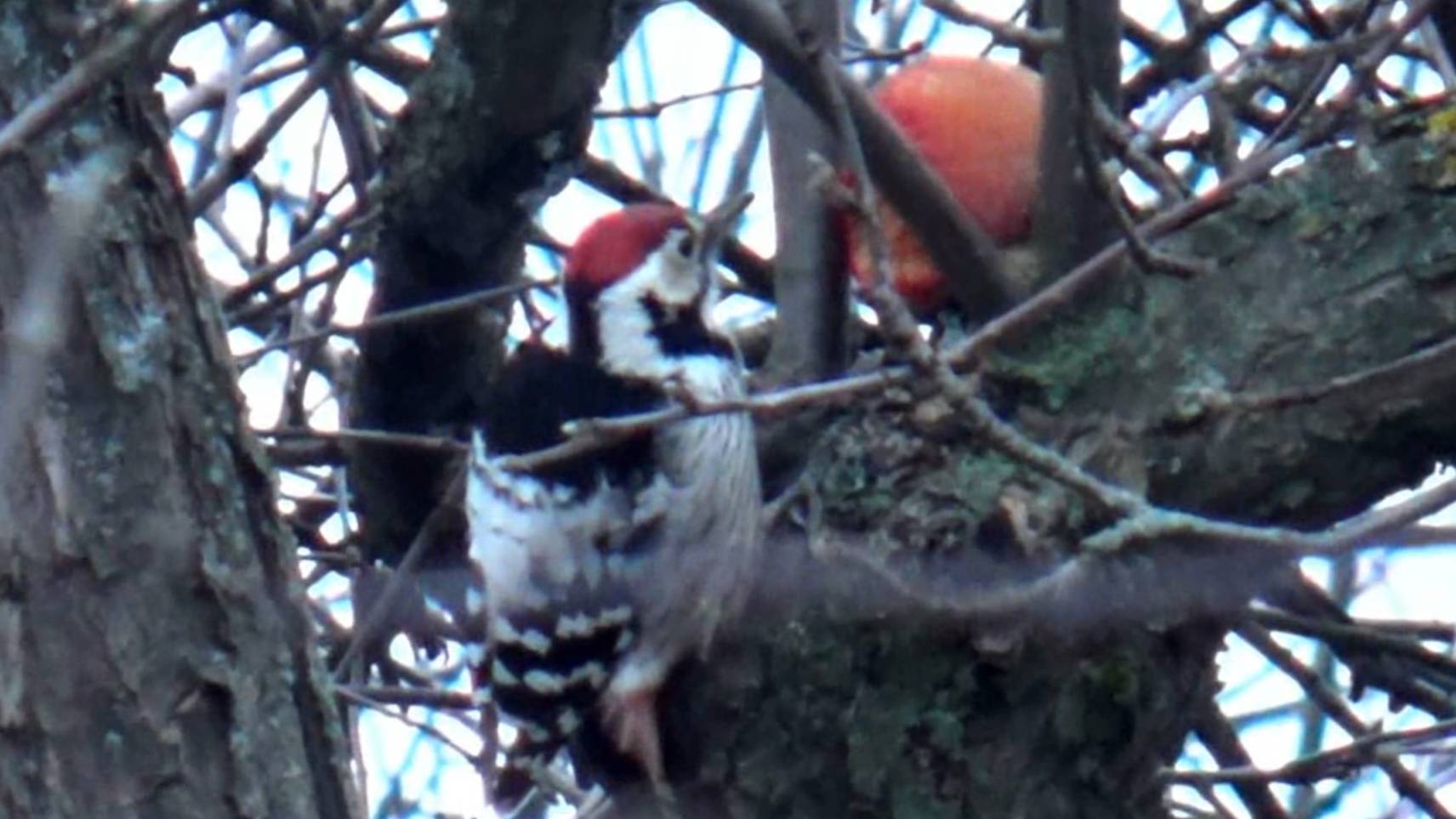 Дятел поедает яблоко
