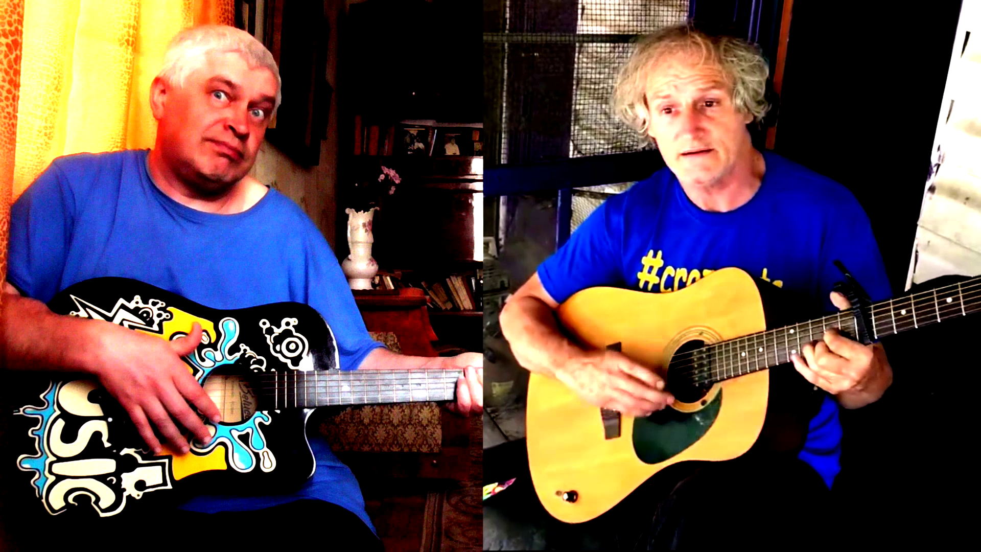 Геннадий Горин с гитарой, а гитарист играет на гитаре и поёт песню