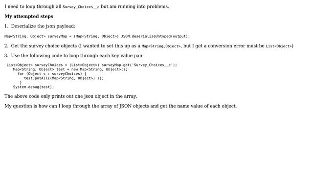 Salesforce: Issue parsing an Array of JSON objects Error: Invalid conversion from runtime type List<ANY> to Map<String,ANY> Helpful? Please support me on Patreon: https://www.patreon.com/roelvandepaar With thanks & praise to God, and with thanks to the many people who have made this project possible! | Content (except music & images) licensed under CC BY-SA https://meta.stackexchange.com/help/licensing | Music: https://www.bensound.com/licensing | Images: https://stocksnap.io/license & others | With thanks to user salesforce-sas (salesforce.stackexchange.com/users/70823), user Davis Handler (salesforce.stackexchange.com/users/80008), and the Stack Exchange Network (salesforce.stackexchange.com/questions/315754). Trademarks are property of their respective owners. Disclaimer: All information is provided "AS IS" without warranty of any kind. You are responsible for your own actions. Please contact me if anything is amiss at Roel D.OT VandePaar A.T gmail.com