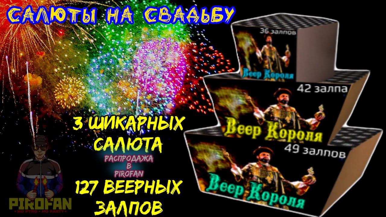 https://vk.com/PiroFan - наш официальный магазин Шикарный набор из 3-х салютов 127 залпов (веерных), фейерверк "Веер Короля" на свадьбу 1. Салют 36 залпов (Веерный) 2. Салют 42 залпа (Веерный) 3. Салют 49 залпов (Веерный) - Срок годности: до 2026 года - Есть сертификат и гарантия от ПироФан ! Для получения желаемой красоты, данные салюты рекомендуется запускать не сразу все три, а по очереди, и тогда все пройдёт максимально сочно