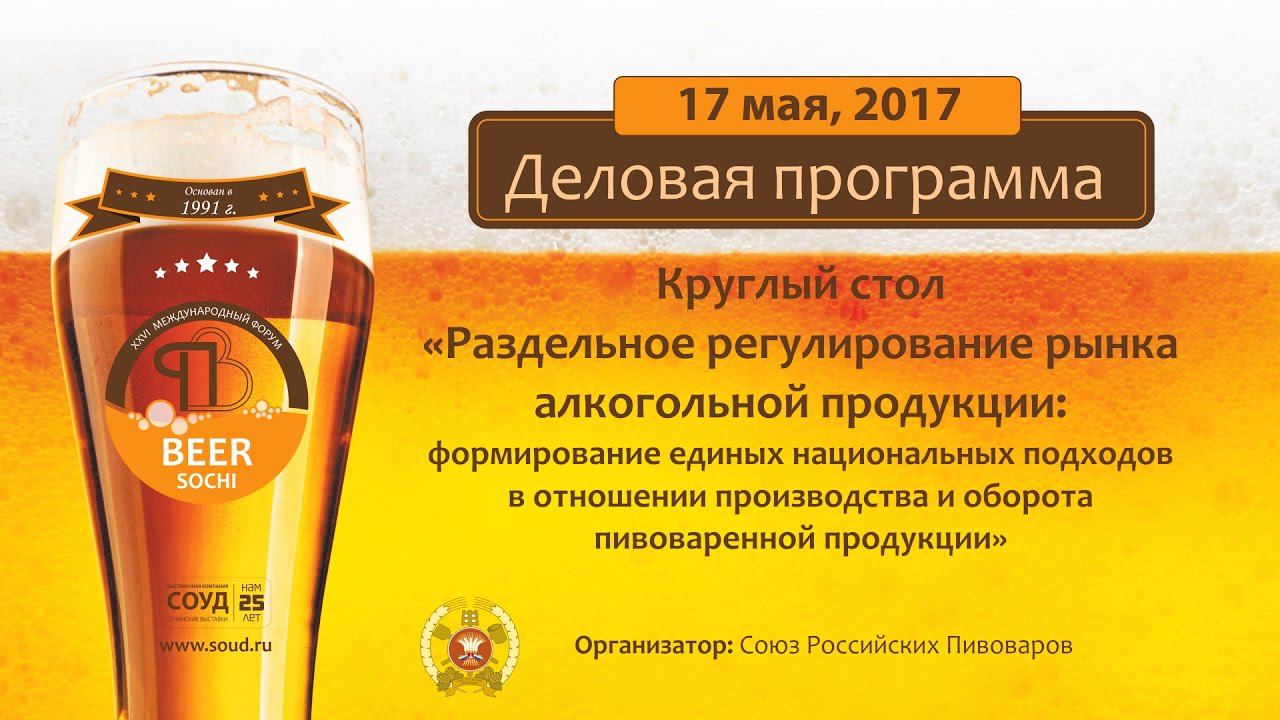 Круглый стол «Раздельное регулирование рынка алкогольной продукции: формирование единых национальных подходов в отношении производства и оборота пивоваренной продукции». Организатор: Союз Российских Пивоваров Участники: представители отраслевых ассоциаций пивоваренных предприятий и пивоваренных компаний Армении, Беларуси, Казахстана, России и Украины . Место проведения: зал «Морской». XХVI международный форум «ПИВО-2017» (16-19 МАЯ 2017) http://www.soud.ru