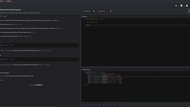 My walkthrough Codewars Javascript challenge Kata - Coefficients of the Quadratic Equation Level - 8kyu