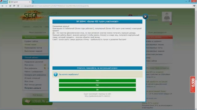 Ссылка на регистрацию- https://goo.gl/QJ7Sx2 ------------------------------------------------------------------------------------------------------------ Ответы при регистрации на СЕО СПРИНТ: 1. Рекламодатель 2. Аккаунт будет удален 3. Категорически запрещены 4. Запрещено 5. Не может. Деньги можно потратить только на рекламу 6. Баланс и площадки обнуляются, деньги не возвращаются, рефералы свободны 7. Покинуть проект