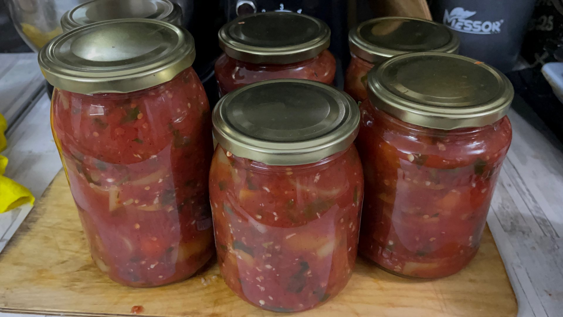 Лечо это очень вкусный соус, который готовим в моей семье уже не первый десяток лет. Получается очень вкусно, все очень любят и просят только больше. Рецепт: Помидор - 3 килограмма Перец - 1 кг красный+ 1 кг зеленый Чеснок - 100 грамм Сахар - 100 грамм Уксус - 100 грамм Острый перец - 2-4 Зелень (петрушка, сельдерей) - 100-150 грамм Соль