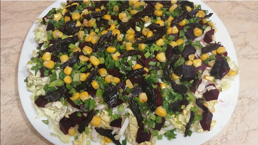 Салат с пекинской капустой, свёклой, кукурузой и черносливом. Постный рецепт.