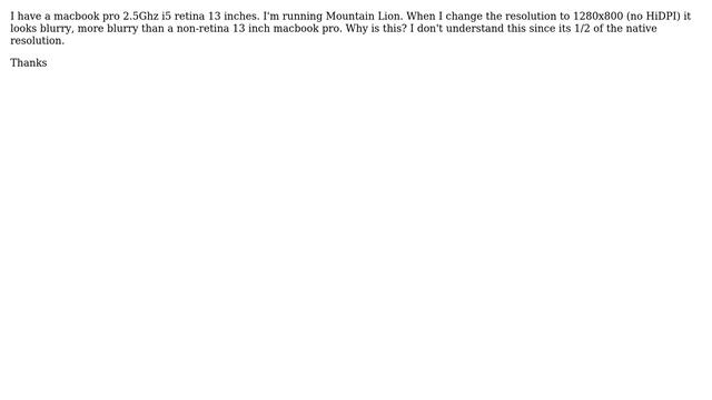 Apple: Macbook Pro retina 13: why 1280x800 (no HiDPI) looks blurry? Helpful? Please support me on Patreon: https://www.patreon.com/roelvandepaar With thanks & praise to God, and with thanks to the many people who have made this project possible! | Content (except music & images) licensed under CC BY-SA https://meta.stackexchange.com/help/licensing | Music: https://www.bensound.com/licensing | Images: https://stocksnap.io/license & others | With thanks to user Panagiotis (apple.stackexchange.com/users/59113), user Jawa (apple.stackexchange.com/users/494), user Agu Dondo (apple.stackexchange.com/users/58200), and the Stack Exchange Network (apple.stackexchange.com/questions/103416). Trademarks are property of their respective owners. Disclaimer: All information is provided "AS IS" without warranty of any kind. You are responsible for your own actions. Please contact me if anything is amiss at Roel D.OT VandePaar A.T gmail.com