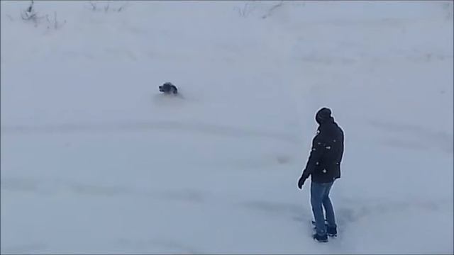 Собака бегает по сугробам за снежками, брошенными хозяином