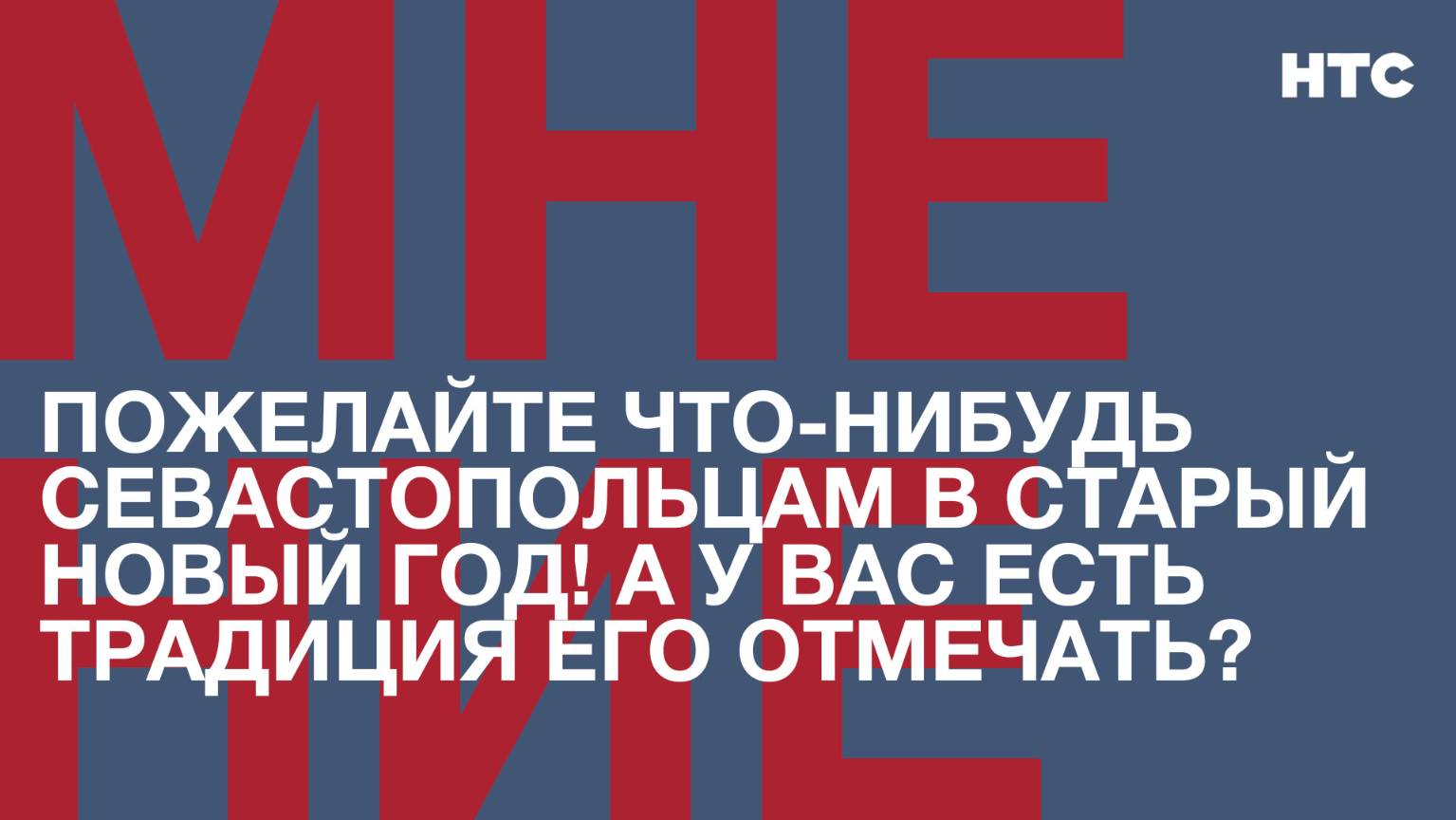 «Независимое телевидение Севастополя» продолжает рубрику «Мнение». Ежедневно в эфире нашего телеканала – ответы севастопольцев и гостей города на вопросы, которые интересны, актуальны и злободневны. Корреспонденты «НТС» работают на улицах города и предоставляют гражданам возможность высказать своё мнение по «Вопросу дня». Сегодня мы попросили севастопольцев пожелать что-нибудь севастопольцам в Старый Новый год. Какой вопрос задать, решают не только журналисты «НТС». Вы можете предложить свой вопрос на общегородские темы, позвонив в редакцию «Независимого телевидения Севастополя» по телефону: 59-00-60 или мобильному: +7 (978) 900-31-31. Подписывайтесь на наш Телеграм-канал: https://t.me/nts_novosti Смотрите новости Севастополя и Крыма на сайте НТС: http://nts-tv.com В нашей группе "ВКонтакте": https://vk.com/ntssevastopol На странице в "Одноклассниках": https://ok.ru/ntssevastopol