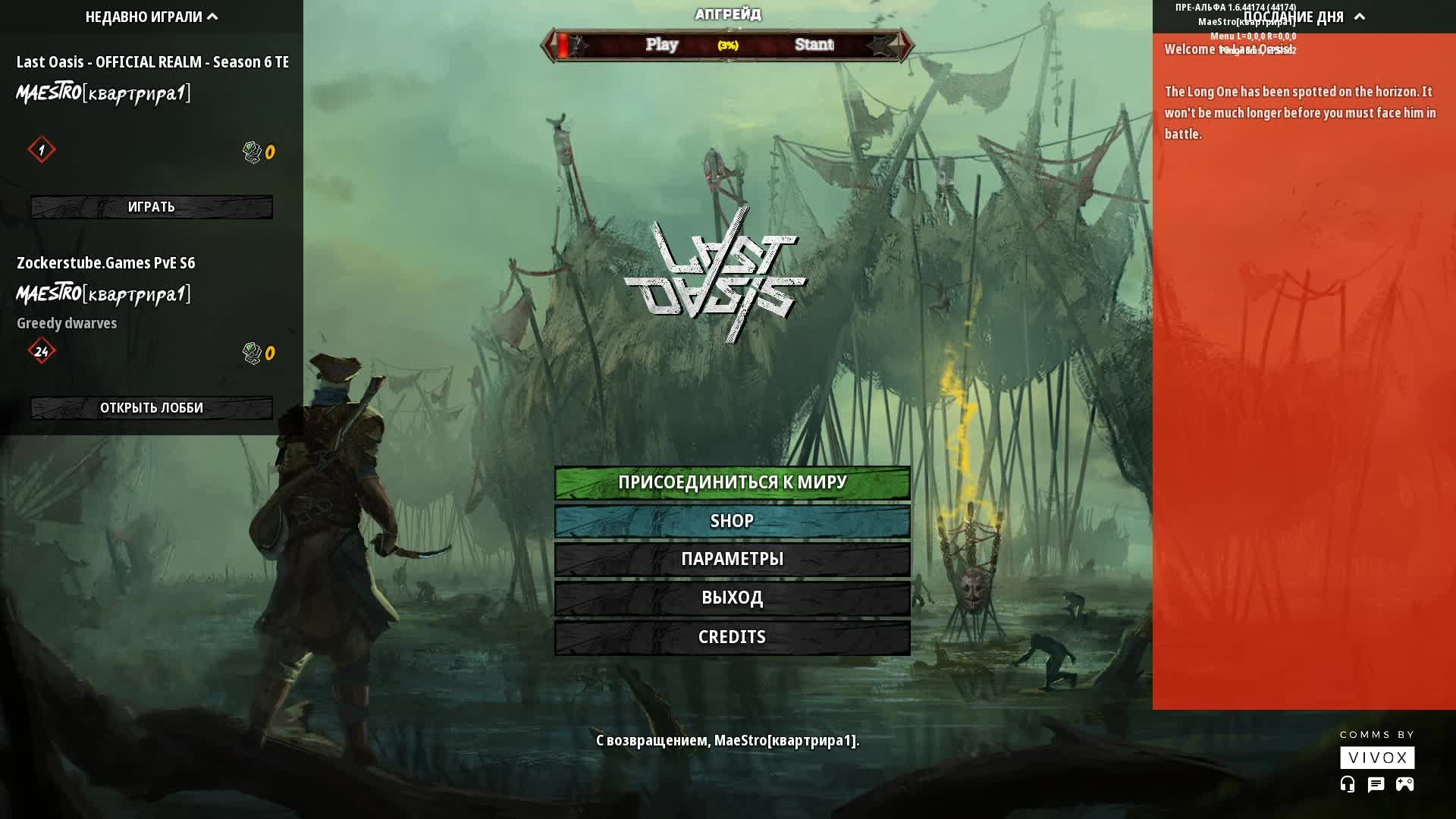 Поддержать канал: https://new.donatepay.ru/@maestro, https://www.donationalerts.com/r/maestrokvartira1 Вступай в отряд - https://boosty.to/maestrokvartira1 и видео сможешь увидеть раньше выхода на канале! БЛАГОДАРЮ ВСЕХ, КТО ПОДДЕРЖАЛ! Last Oasis - ДИКИЕ ЛЮДИ, ДИКИЕ КРАЯ(Кооперативное прохождение )🕹 Стрим #7 Ютуб канал: https://www.youtube.com/maestrokvartira1 Также на платформах: Твич: https://www.twitch.tv/maestrokvartira1 Дзен: https://zen.yandex.ru/maestrokvartira1 Rutube https://rutube.ru/channel/23549469/ VK стримы: https://live.vkvideo.ru/maestrokvartira1 VK видео: https://vkvideo.ru/@club229729402