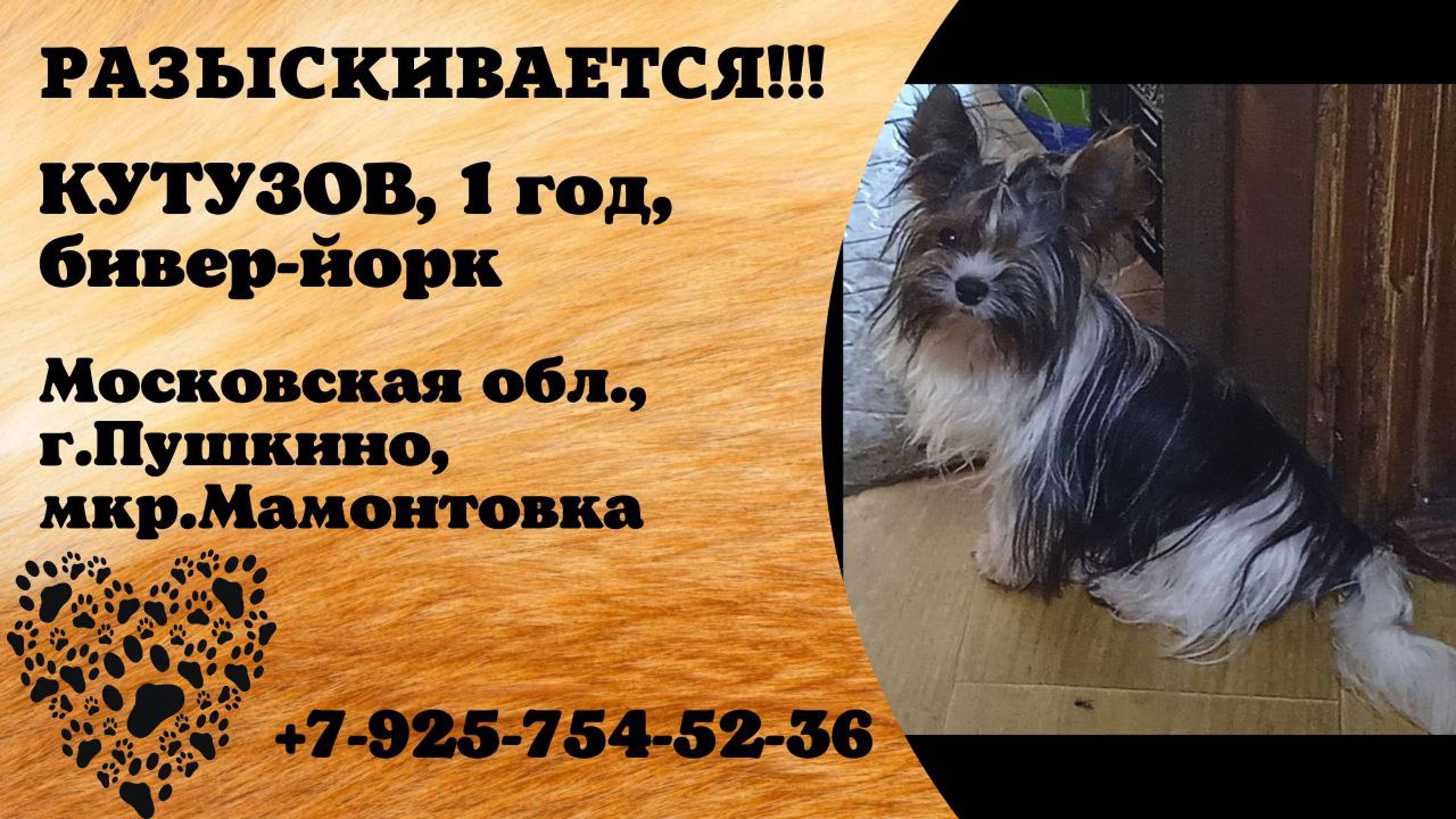 Пропала собака! КУТУЗОВ. 1 год. Бивер-йорк. Московская обл, г. Пушкино, мкр. Мамонтовка