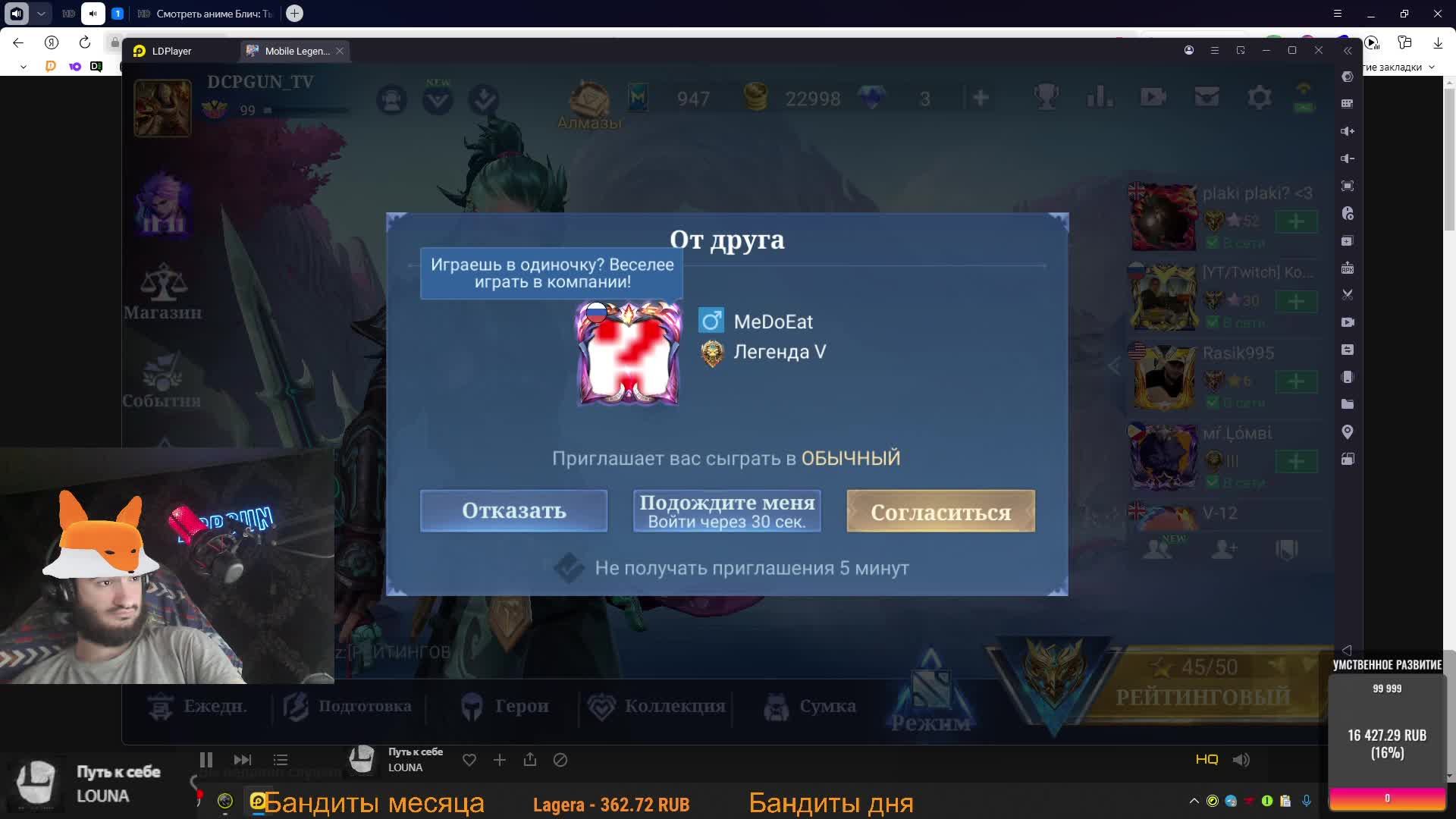 Отключите впн при переходе на донат ссылки Поддержать стримера: https://donate.stream/dcpgun альтернативы если первая ссылка не работает https://www.donationalerts.com/r/dcpgun_ https://new.donatepay.ru/@DCPGUN или на карту юмани 2204120115137826 Всем привет, меня зовут Сэм DCPGUN мне 28 и я стример по Mobile Legends! Да, у меня ДЦП и Я играю в моблу, и что ты мне сделаешь? Адреса моих крипто кошельков USDT TRC20 TDMhjeZUUq7u2C4xcN2YtgoJjnkfyacveb BTC 12XJSPHrzhKFqrR5DrFJBquM3jhCCnDuun ETH ERC20 0x75030164cd72924d7dab1f25398a87d9e21073ad Наш тг чат https://t.me/DCPGUNS Наш тг канал https://t.me/DCPGUNG ID 1172749311 (6552) Роли: Лес,Адк,Роум,Опыт,Мид Макс ранг 61 звезда Играю с ПК Эмулятор LdPlayer 9 Цены на услуги от DCPШНИКА Заказ трека 100р. (вставьте ссылку на ютуб клип нажав кнопку ВИДЕОРОЛИК)