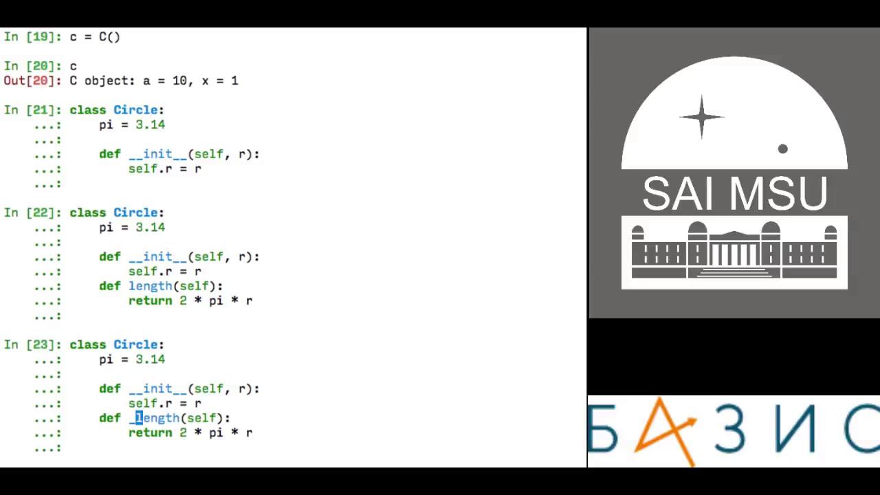 Еще немного о строках, генераторы, модули, введение в классы Файлы, написанные на этом занятии: https://github.com/hombit/scientific_python/blob/master/misc/jupyter_notebooks/18.09.26 Репозиторий курса: https://github.com/hombit/scientific_python/ Разработка курса поддержана Фондом «БАЗИС»
