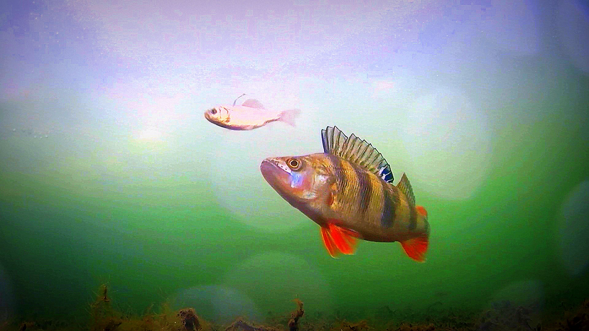 Первый лед, расставил жерлицы на щуку и окуня, поклевок долго ждать не приходилось, подводная съемка