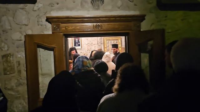 Верующие получают пирог Василия Великого из рук Патриарха Иерусалимского