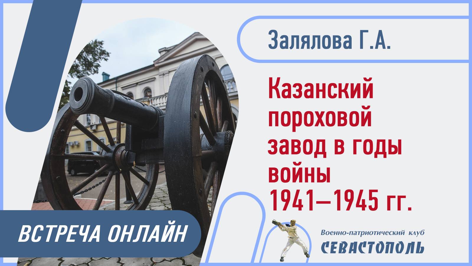 Военно-патриотический клуб "Севастополь" приглашает детско-юношеские и молодежные отряды этой осенью принять участие в программе "Всё для фронта!", которая посвящена вкладу трудящихся СССР в Великую Победу и традиционно будет включать цикл видеоуроков и итоговый Интернет-Чемпионат. Интересная встреча по теме: “Оплот обороны России” Казанский пороховой завод в годы войны 1941-1945 гг. Лектор: Залялова Гузалия Ахметовна - заведующая музеем боевой и трудовой славы “Заречье” Казанского порохового завода